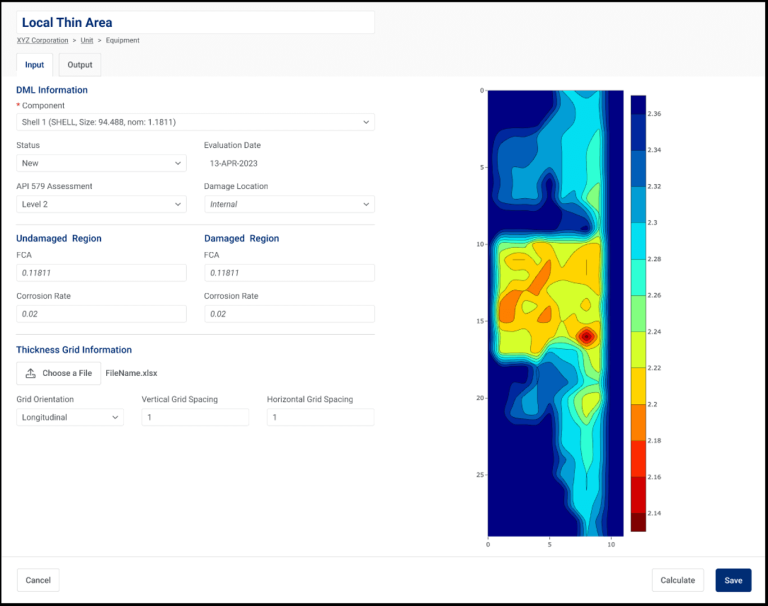 Achieve end-to-end asset lifecycle management capabilities by recording damage management locations (DMLs), managing inspection activities, and calculating fully quantitative API 581 risk assessments for inspection optimization.